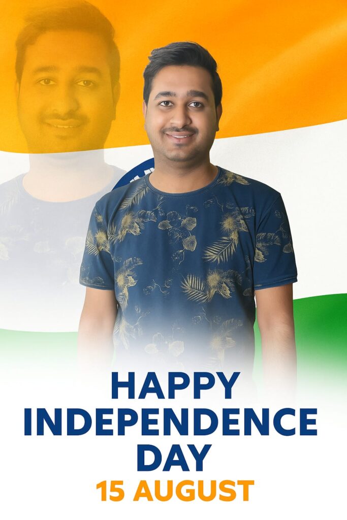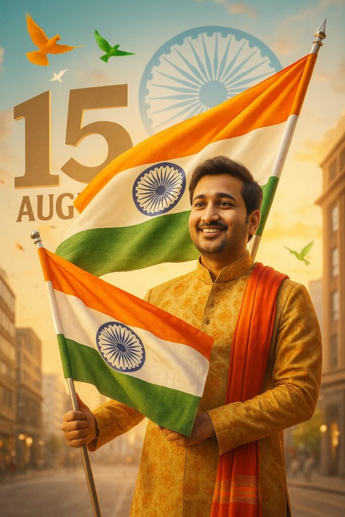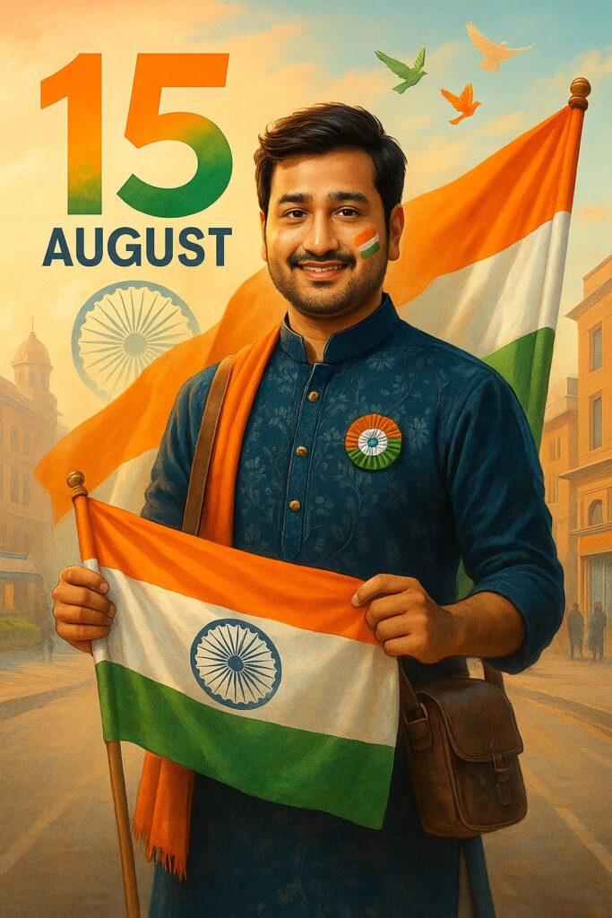 A digital graphic design composition features a young Indian man with the same face, hairstyle, and expression as shown in the provided image. He is standing in an urban environment, proudly holding the Indian national flag. He is dressed in a stylish festive outfit suitable for Independence Day. The background includes elements like the large “15 August” text, Ashoka Chakra, and tricolor birds flying in the sky. The overall tone is vibrant and patriotic, with natural lighting and a photorealistic style that emphasizes national pride.