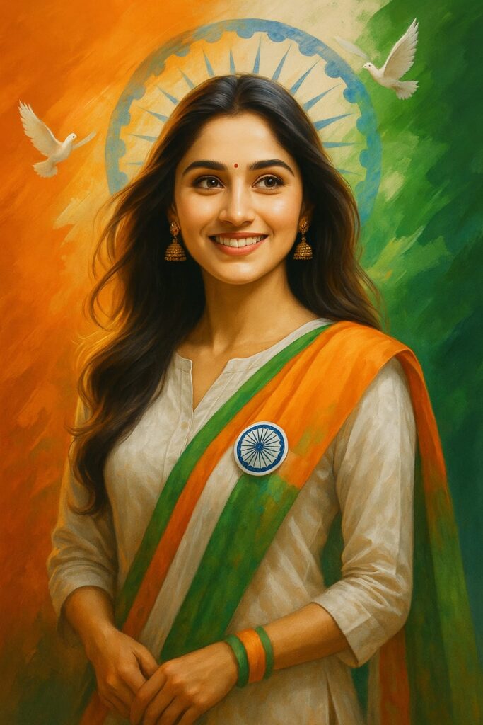 A digital portrait of a young woman, celebrating India’s Independence Day. She is wearing a traditional white kurta with a vibrant tricolor dupatta, which drapes elegantly from her right shoulder across her left side, falling around her waist. The dupatta features saffron, white, and green colors, with the iconic tricolor round badge pinned on her left side. She has a soft, radiant smile with elegant earrings, and her hair is styled just as in the uploaded photo, with soft waves. The background is a rich blend of saffron, white, and green, with the Ashoka Chakra subtly placed in the center, and doves flying gracefully in the background. The image should also reflect the same style and settings as the uploaded reference image, with proper attention to the hairstyle and other unique features from the user’s photo.